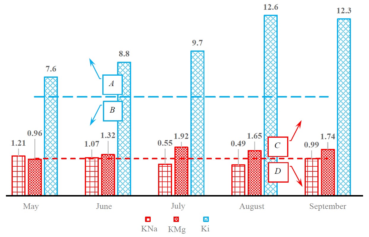 The main cation pollutants were sodium (in combination with potassium), its highest concentration of 299 mg/dm3 was noted in May, in July it decreased almost to MPCf (202 mg/dm3 against 200 mg/dm3), as well as magnesium, concentration of which in July exceeded MPCf by 28 mg/dm3. The sharp increase in sulfate and magnesium ions in July could have been caused by a decrease in water content of the reservoir intake zone due to changes in hydrological regime, high air temperatures and absence of precipitation. This conclusion is confirmed by earlier research results on water quality in natural water sources in the considered territory of irrigated agriculture [9, 10].