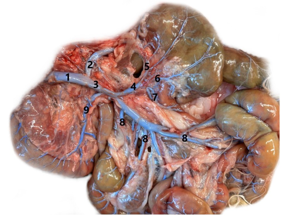 6 — слепокишечная вена; 7 — подвздошные вены; 8 — тощекишечные вены; 9 — каудальная поджелудочно-двенадцатиперстная вена