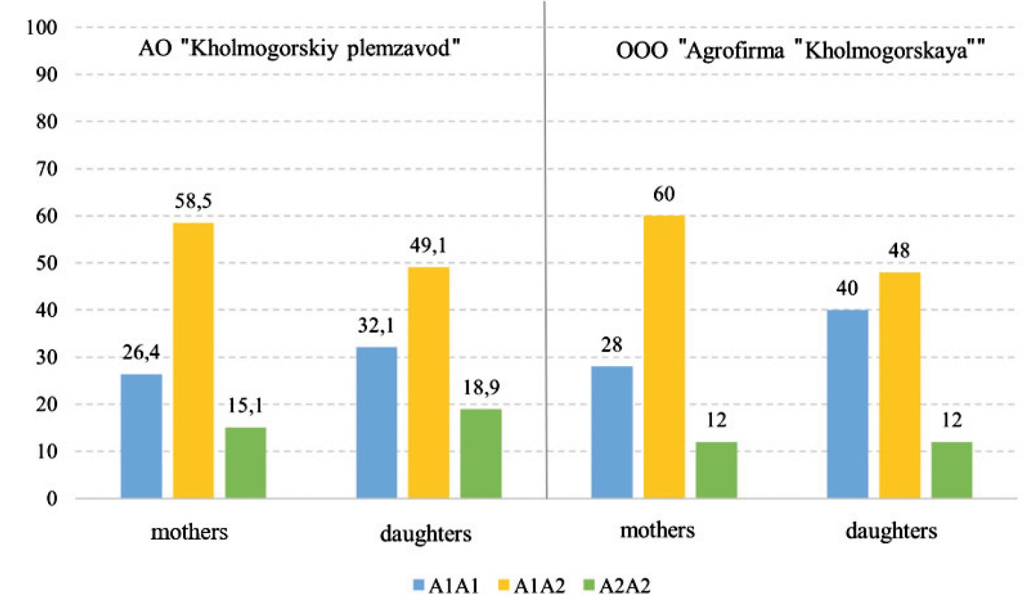 The relevance of the study lies in the possibility of purposeful formation of a highly productive dairy herd of cattle with the most desirable gene combinations based on the identified patterns of genotype inheritance. The aim of the study was to determine patterns of inheritance of desired genotype in daughter offspring from various genotypes of their mothers and compare them with indicators of milk productivity. The study was conducted on two generations of cattle of Kholmogorsky breed (cows and their offspring) on the basis of ʺAgrofirma ‘Kholmogorskaya’ʺ and ʺKholmogorsky plemzavodʺ. Determination of beta-casein gene polymorphism in Kholmogorsky cows was carried out by Allele-specific polymerase chain reaction method. There was a predominance of heterozygous beta-casein genotype in two generations, which was 58.5 and 60.0% in mother cows and 49.1 and 48.0% in daughter offspring. In both herds, the dominance of A1 allele was observed, which, accordingly, affects the inheritance of A1 allelic variants of genotypes, but A1A2 genotype was more common. In order to determine the most promising genotype for further breeding work, an assessment of milk productivity was carried out in terms of milk yield, fat and protein in milk for 305 days of the first lactation. Cows with A1A2 genotype were mainly characterized by higher milk yield. In the studied herds, the dominance of A1 allele and the predominance of cows with heterozygous A1A2 genotype were observed. On average, in farms for 305 days of the first lactation, cows carrying genotypes with A2 allele variant (A1A2 and A2A2) had the highest indicators for qualitative and quantitative composition of milk. Thus, in order to produce high-quality dairy products and effectively conduct breeding work on farms, it is necessary to increase the number of animals carrying A2A2 genotype.