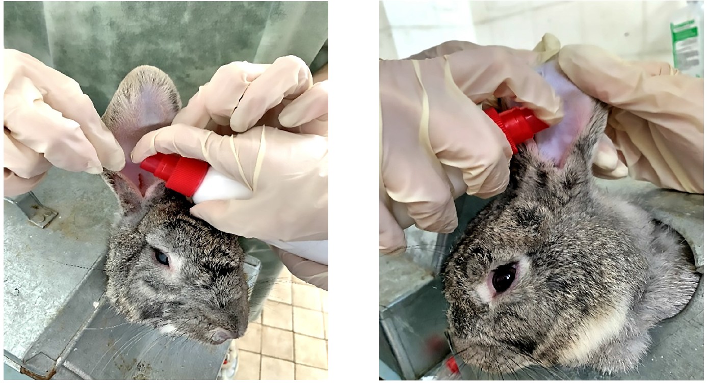 All drugs were sprayed onto the entire affected surface of the ear (Fig. 1). The treatment was done once every day, rabbits were fixed, the duration of treatment was 30 days.