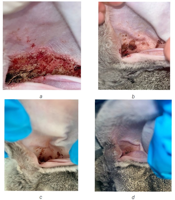Figure 2. Recovery сlinical signs on rabbits’ model: a — 5 days treatment with Surolan; b — 10 days; c — 15 days; d — 20 days