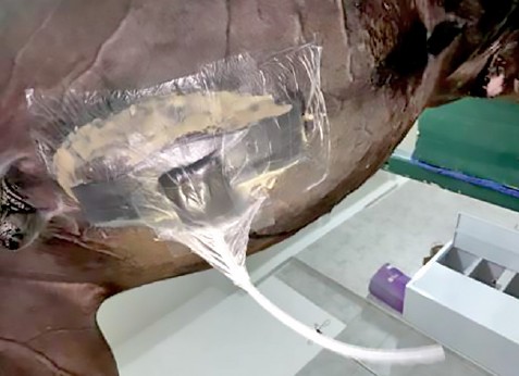 Fig. 4. Attaching the urethane-foam sponge and adhesive film to the wound