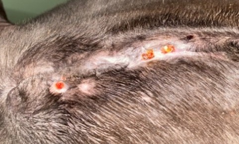 2 | Cytology | Neutrophilic and lymphocytic infiltration, abundant coccal flora +++ | Neutrophilic and lymphocytic infiltration, abundant coccal flora +++ | Neutrophilic and lymphocytic infiltration, moderate coccal flora ++ | Neutrophilic and lymphocytic infiltration, moderate coccal flora + Keratinocytes + |