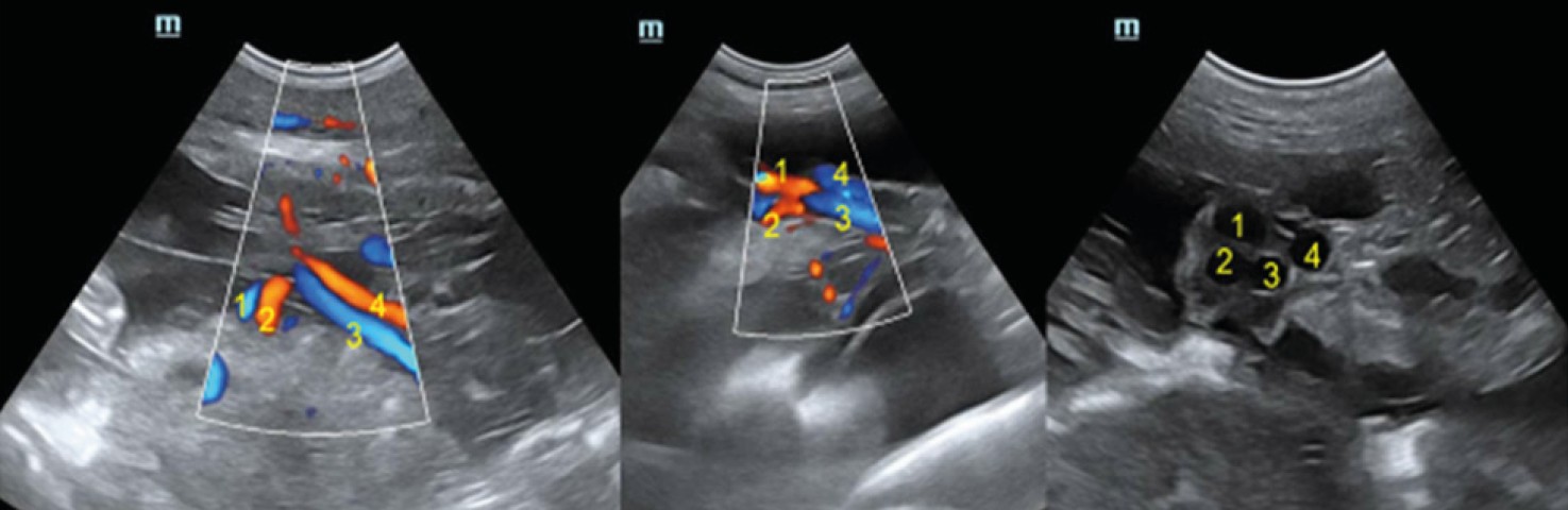Fig. 5. Scanning of umbilical cord vessels in a dog fetus in color Doppler and B-mode. The numbers indicate the vessels of the arterial (2, 4) and venous (1, 3) beds