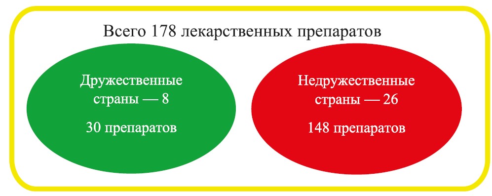 Eight friendly countries (Montenegro, Belarus, China, India, Slovenia, Serbia, Croatia, UAE) supply only 30 types of medicines to Russia. The absolute majority of supplies (148) are from 26 unfriendly countries, i. e. 5 times more than from friendly ones. The tendency to reduce the presence of suppliers from unfriendly countries poses a threat of shortage of certain types of medicines in the Russian market [10, 11].