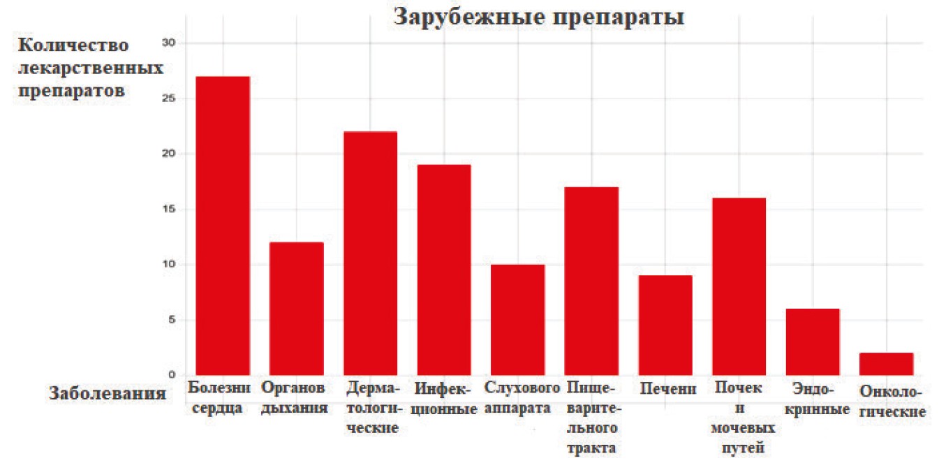 There is a certain parity of foreign and Russian drugs for most diseases (see Fig. 2 and 3). The largest number of drugs are created for the treatment of heart diseases (29 foreign and 31 Russian), the digestive tract (22 and 26, respectively), dermatological diseases (22 and 26), kidneys and urinary tract (16 and 12). There are not enough drugs for the treatment of endocrine and oncological diseases. For almost every disease, the number of Russian drugs allows replacing foreign analogues. But will such a replacement ensure the preservation of the quality of the treatment process, will the volume of Russian production be enough to cover the needs for drugs?