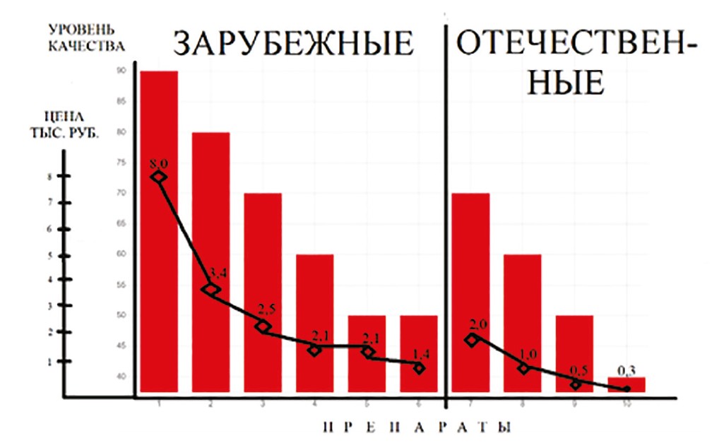 The medicinal market is characterized by significant price fluctuations, which for different drugs of the same purpose (therapeutically equivalent) can range from tens to several thousand rubles. For example, the drug for the treatment of heart failure Vetmedin costs about 4000 rubles, and Pimocardin — only 2000 rubles [12, 13]. Although the price does matter, it should play a secondary role when choosing a drug.