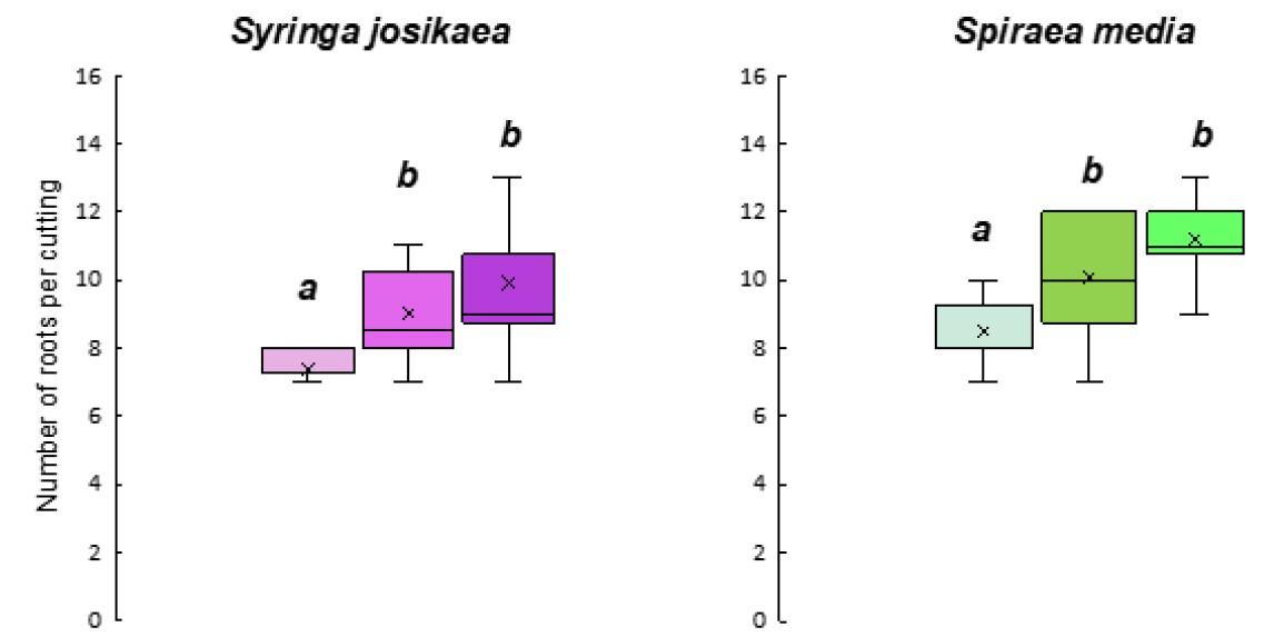 Fig. 2. Effect of IBA growth regulator on number of roots per cutting of Syringa josikaea and Spiraea media. Values with different letters differ significantly (p < 0.05) for different treatments (ANOVA, Tukey’s test).