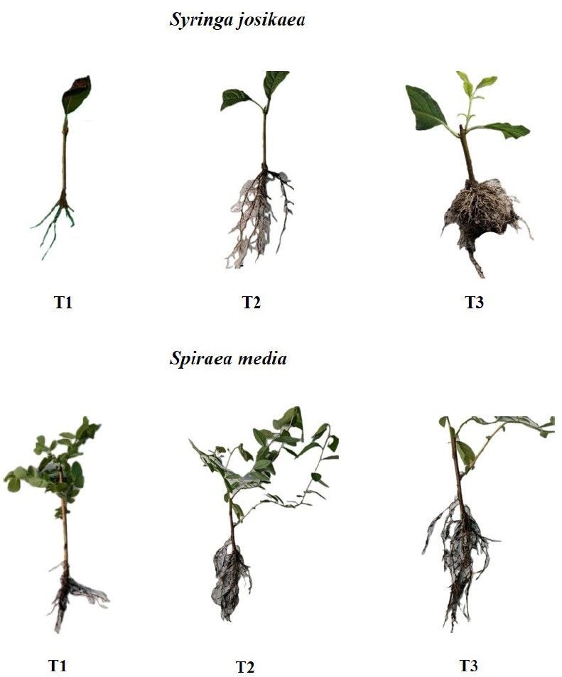 Shoot growth. The maximum shoot growth (14.9 cm) was recorded in Spiraea media cuttings treated with IBA for 12 hours (T3), while the minimum (1.3 cm) was recorded in the control (T1) (Table). This parameter in Syringa josikaea cuttings varied within a lower range of values than in Spiraea media, but the trend identified for it was maintained. For both plant species, the effect of auxin treatment on cuttings was increased shoot growth compared to the control, especially with 12‑hour treatment. Increased shoot growth in cuttings may be due to active root growth and a larger number of roots per cutting, which in turn increases the absorption of water and nutrients. In IBA-treated cuttings, auxin increased cell division, cell elongation, and protein synthesis, which could lead to increased healthy vegetative growth. Similar results were also obtained by Kumaresan et al. for Jasminum multiflorum [19] and Mohammed et al. for some rose cultivars [23].