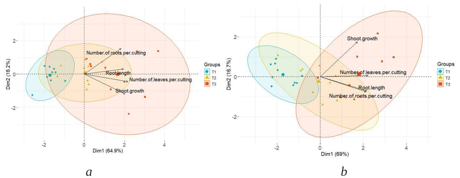 In Spiraea media, the maximum contribution to variance is due to the first component (69%), which includes parameters such as root length and number, shoot growth, and number of leaves per cutting. In this plant species, the treatment types formed isolated ellipses, where the effect of a 12‑hour treatment with a growth stimulator was the best, especially on shoot growth.