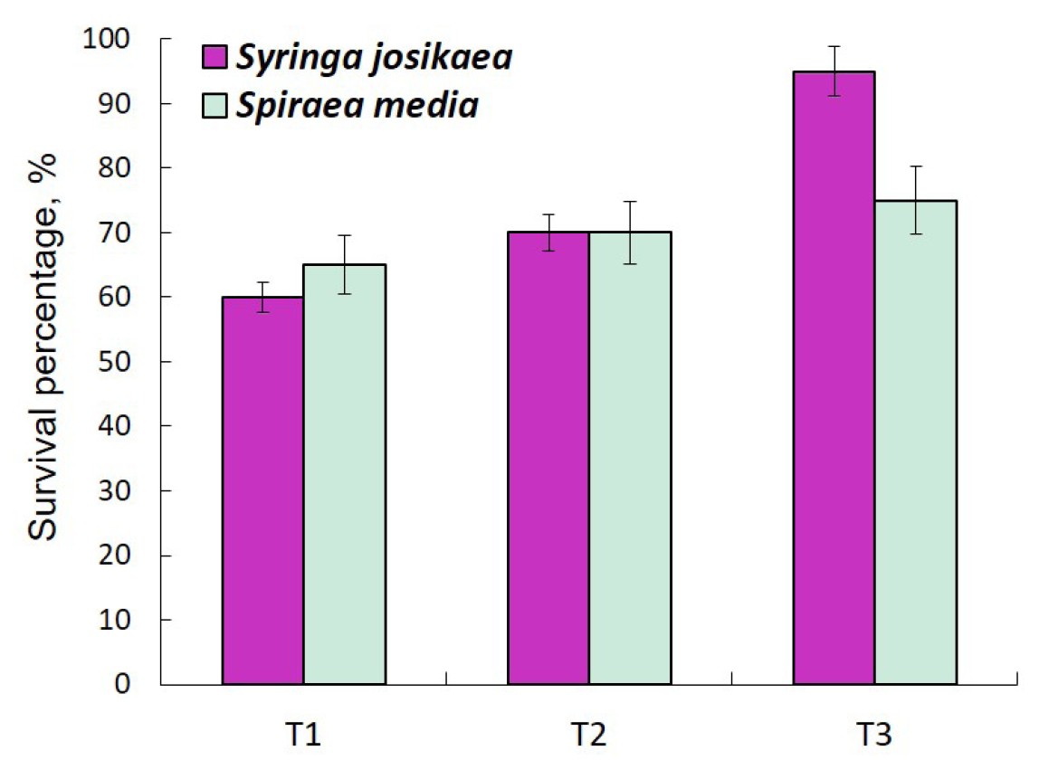 Survival rate. The proportion of rooted plants without the use of growth substances (T1) varied from 60 (Syringa josikaea) to 65% (Spiraea media) (Fig. 6). In cuttings of both species, which were in the growth stimulator for 6 hours, rooting was 70%. Treatment for 12 hours increased the survival rate for spirea to 75, and for lilac to 95. Thus, a 12‑hour exposure to the growth stimulator had the greatest effect on the rooting of green cuttings of Syringa josikaea, for Spiraea media it was less significant. In both plants, very thin cuttings cut from the upper part of the shoots did not root.