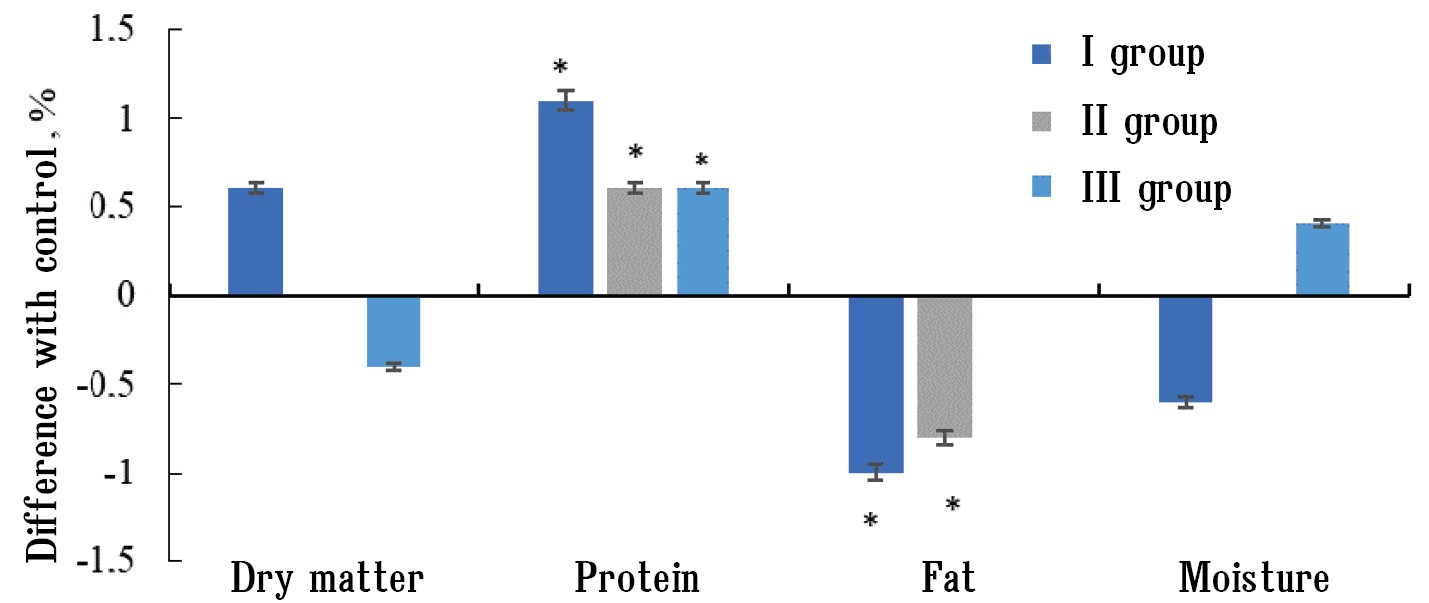 Fig. 2. The difference in the chemical composition of the muscle tissue of Arbor Aсres broiler chickens at the age of 42 days (vivarium experiment, M ± m), %