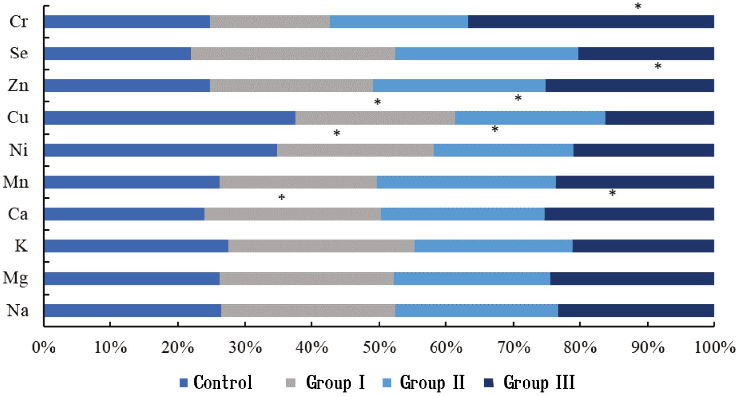 The concentration of Mn and Zn increases relative to the control group, respectively, by 25 (p < 0.05); 12.5% (group I) and 12.5 (p < 0.05); 6.5% (group III).
