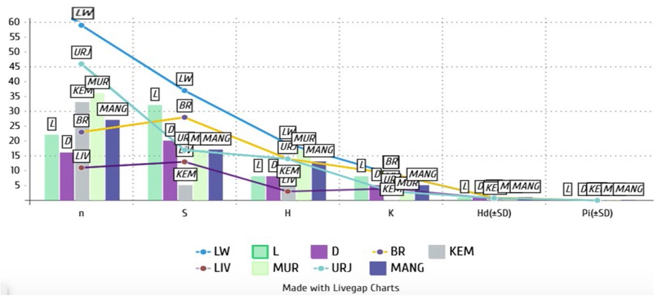 Рис. 3. Показатели генетического разнообразия у исследованных пород домашних свиней: LW — крупная белая; L — ландрас; D — дюрок; BR — брейтовская; KEM — кемеровская; LIV — ливенская; MUR — муромская; URJ — уржумская; MANG — мангалица; n — количество образцов; S — число полиморфных сайтов; K — среднее число нуклеотидных различий; H — число гаплотипов; Hd — гаплотипическое разнообразие; Pi — нуклеотидное разнообразие; SD — стандартное отклонение