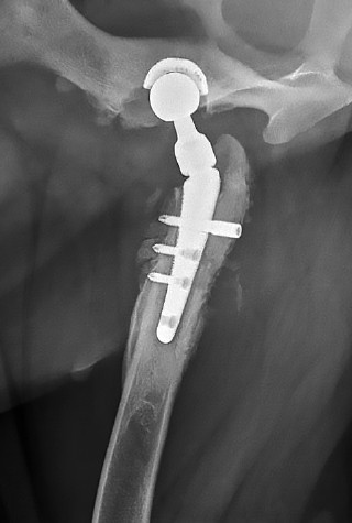 Рис. 2. Рентгенография пациента через 45 дней после тотального эндопротезирования тазобедренного сустава. Отмечается периостальная и эндостальная костная реакция вокруг бедренного компонента импланта