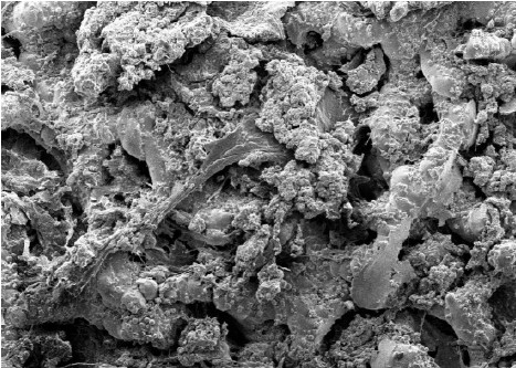 Костная ткань врастает в пористую поверхность бедренного компонента (ножки) аналогично заживлению перелома: сначала реагируя на хирургическую травму, а затем прорастая в структуру импланта, архитектура которого имитирует естественную кость [13]. На полученных изображениях импланта наблюдается плотный ободок, окружающий головку ножки эндопротеза в зоне перехода к держателю головки. Его высота составляет 1 мм, поверхность мелкозернистая, шероховатая, без признаков тканевого субстрата. Структура импланта характеризуется толщиной стенок ячеек в пределах 200…350 мкм и размером ячеек 300 × 400 мкм. Полости, а также частично поверхность импланта в этой области, заполнены волокнистым субстратом. В отдельных участках металлоконструкции поверхностные структуры погружены в аморфное вещество с очагами кристаллизации. На поверхности импланта выявлены прикрепленные клетки. В зоне перехода от головной к проксимальной части отмечается образование костных трабекул (рис. 4). При большом увеличении видно, что поверхность импланта имеет шарообразные выступы диаметром 10–30 мкм, улучшает ее сцепление с тканевым матриксом.