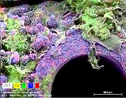Рис. 6. Сканирующая электронная микроскопия и карта элементного анализа распределения остеотропных элементов Са и Р на поверхности извлеченного эндопротеза в срединной части ножки. Увеличение: 105×: Са — желтый; Р — зеленый; Ti — синий; V — красный