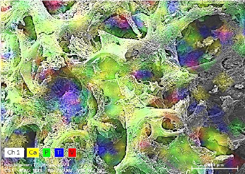 - снижение интенсивности сигнала титана Ti, что свидетельствует о практически полном покрытии поверхности костной тканью.