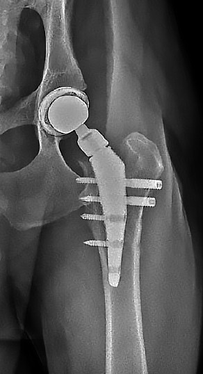 Рис. 8. Послеоперационная контрольная рентгенография после протезирования тазобедренного сустава с использованием двух монокортикальных и двух бикортикальных винтов. Дистальное отверстие не используется