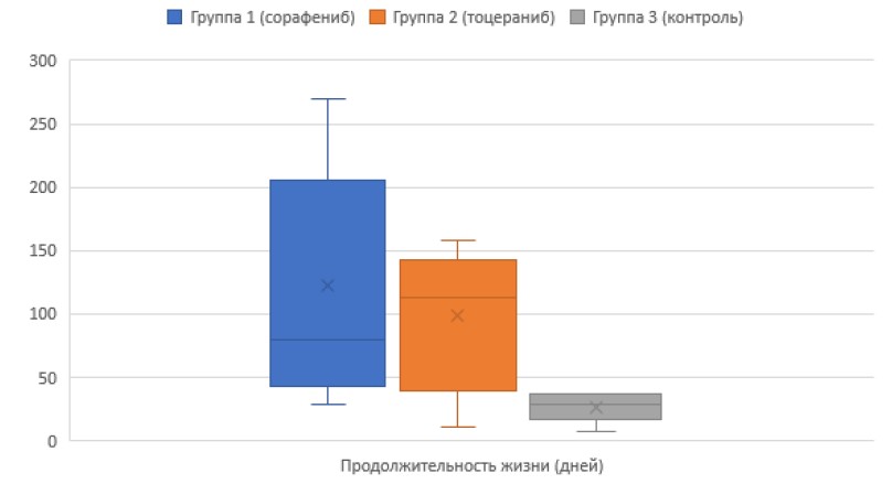 Сравнение продолжительности безрецидивного периода и продолжительности жизни животных группы 1 (сорафениб) и группы 2 (тоцераниб) с помощью критерия Манна — Уитни не выявило статистически значимого отличия.